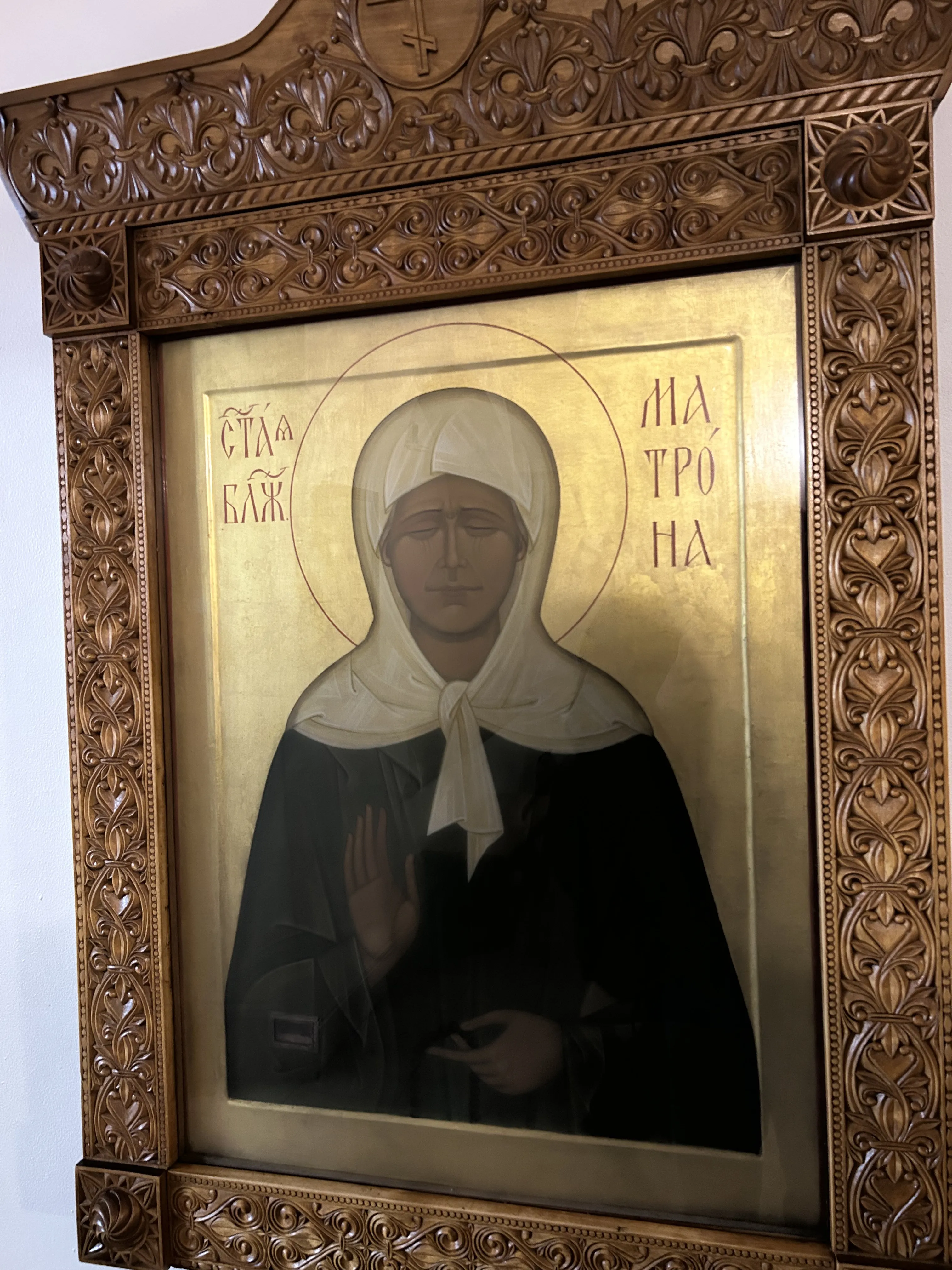 Икона блаженной Матроны Московской находится в Покровском храме слева. В образе покоится частица мощей святой. Святая Матрона являет себя помощницей и заступницей во многих житейских вопросах. Верующие просят у нее разрешения личных проблем и даровании веры, ведь во время испытаний и гонений блаженная не отреклась от Господа и помогала приходящим к ней.
