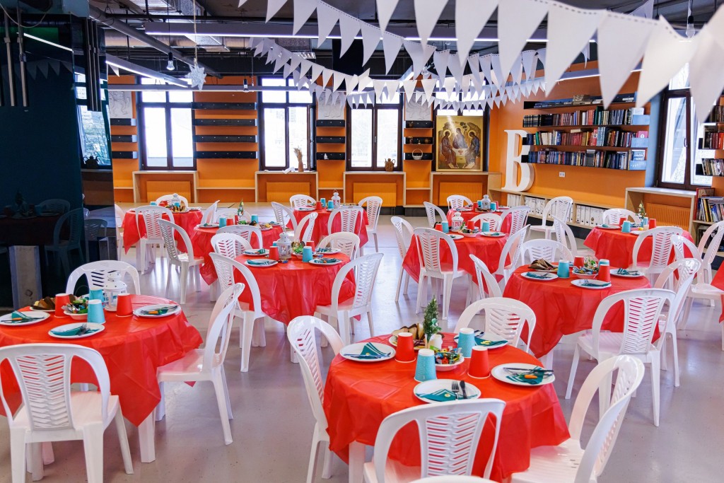 Волонтёры празднично оформили зал, накрыли столы скатертями и разложили столовые приборы.