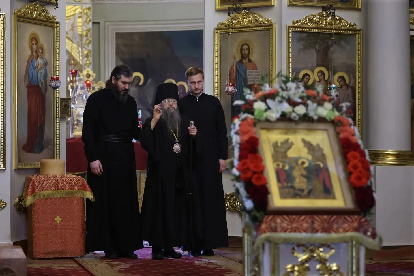 14 апреля 2026 г. в Троицком соборе Данилова монастыря сотрудники обители поздравили епископа Солнечногорского Алексия с праздником Светлого Христово Воскресения.