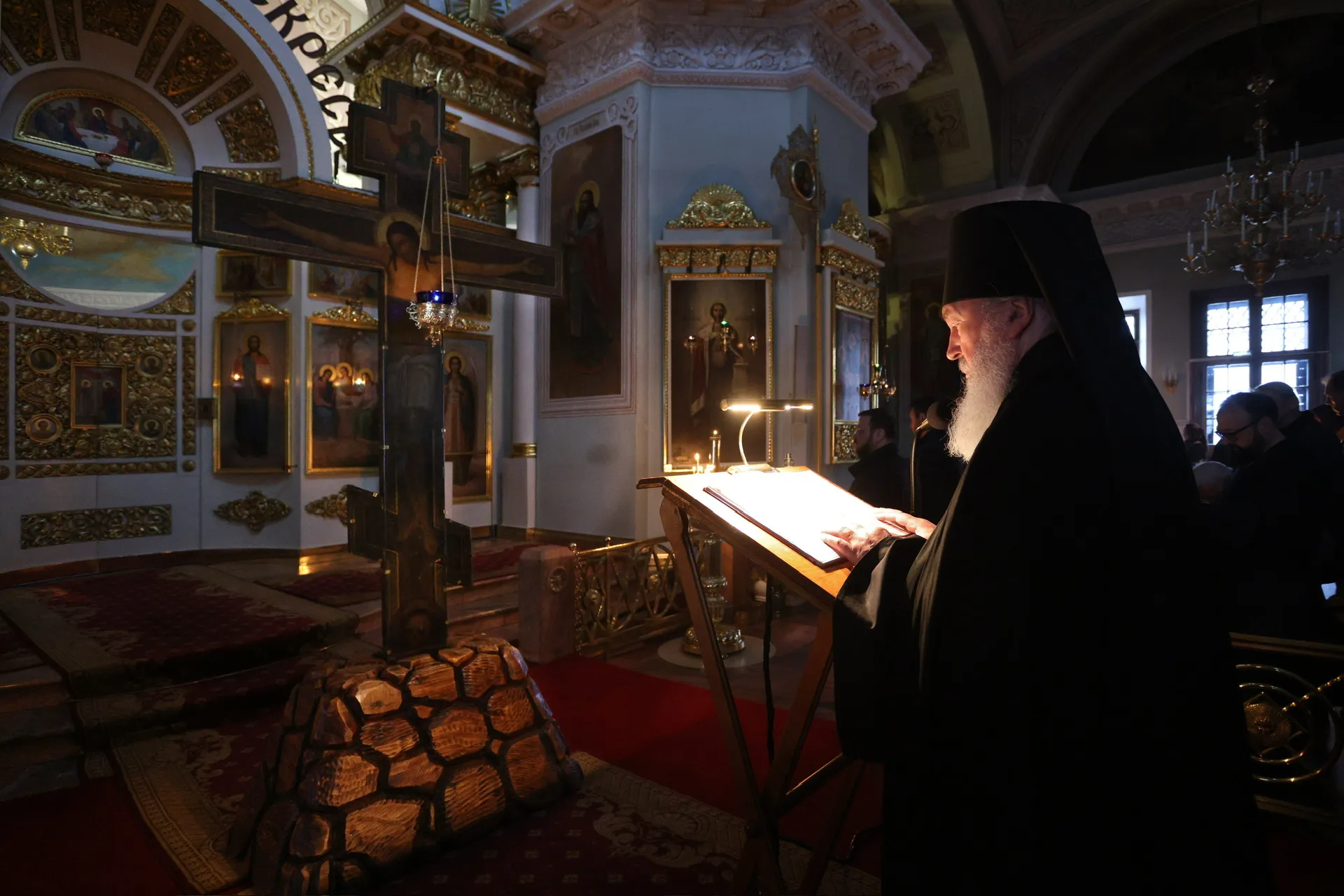 Вечером 10 апреля 2026 г., в четверг Страстной седмицы, в Троицком соборе Данилова монастыря совершена утреня Великого Пятка с чтением двенадцати Страстных Евангелий. Богослужение возглавил благочинный обители архимандрит Лука (Пинаев) в сослужении братии монастыря в священном сане.