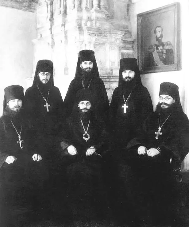 3. Сидят слева направо: архимандрит Варлаам (Ряшенцев), епископ Феодор (Поздеевский), архимандрит Симеон (Холмогоров); стоят: иеромонах Гурий (Степанов), иеромонах Филипп (Гумилевский), иеромонах Герман (Ряшенцев). МДА, 1909-1910 гг.