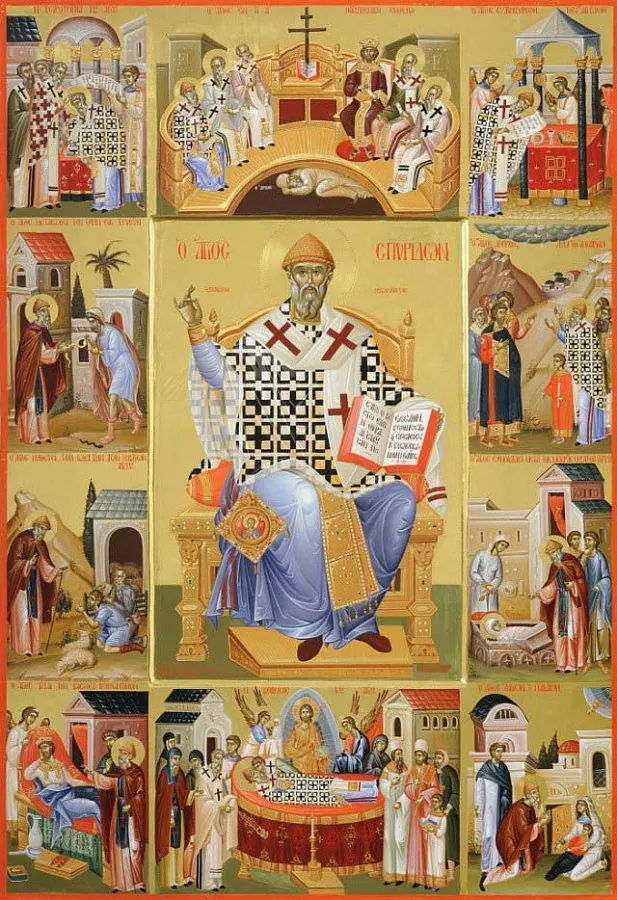 Препрославленный от Господа святителю и чудотворче Спиридоне! Ныне всечестную память твою празднующе, яко много могущему споспешествовати нам о прославльшем тя Христе, умильно вопием ти: избави нас от всяких бед и зол, да с благодарением зовем ти: