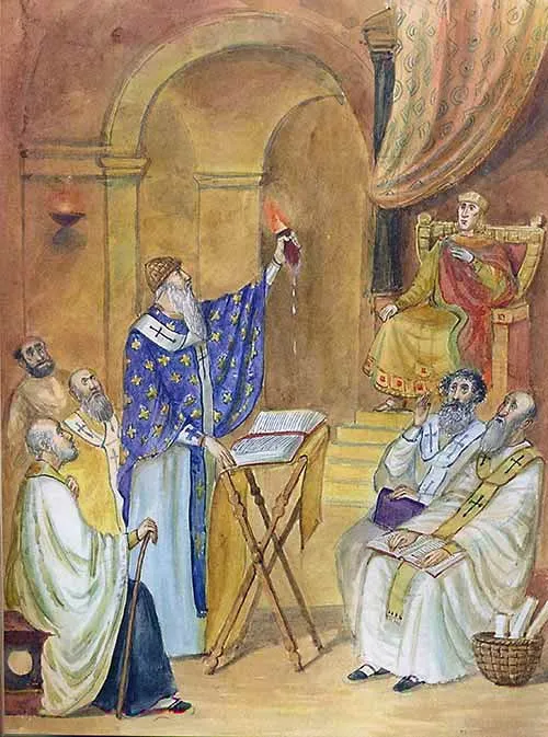 Святитель Спиридон вместе со святителем Николаем, архиепископом Мир Ликийских, участвовал в Первом Вселенском Соборе в Никее, осудившем арианскую ересь. Говоря с противниками исповедания Святой Троицы, он воочию показал Ее Единство и Троичность: взяв в руки кирпич, святой сжал его и разложил на три составные части — огонь, воду и глину. «Так и в Троице, — сказал святитель, — Три Лица, но Единое Божество».