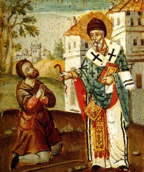 Вместе со своими домашними он отправился на кладбище. Наклонившись над могилой, он прочитал молитву и обратился к мертвой дочери, как к живой, со словами: «Дочь моя Ирина! Где находятся украшения, отданные тебе на хранение?» В ту же минуту голос из глубины могилы указал место, где спрятано сокровище. Тогда святитель сказал: «А теперь спи, дочь моя, пока не разбудит тебя Господь во время всеобщего воскресения».